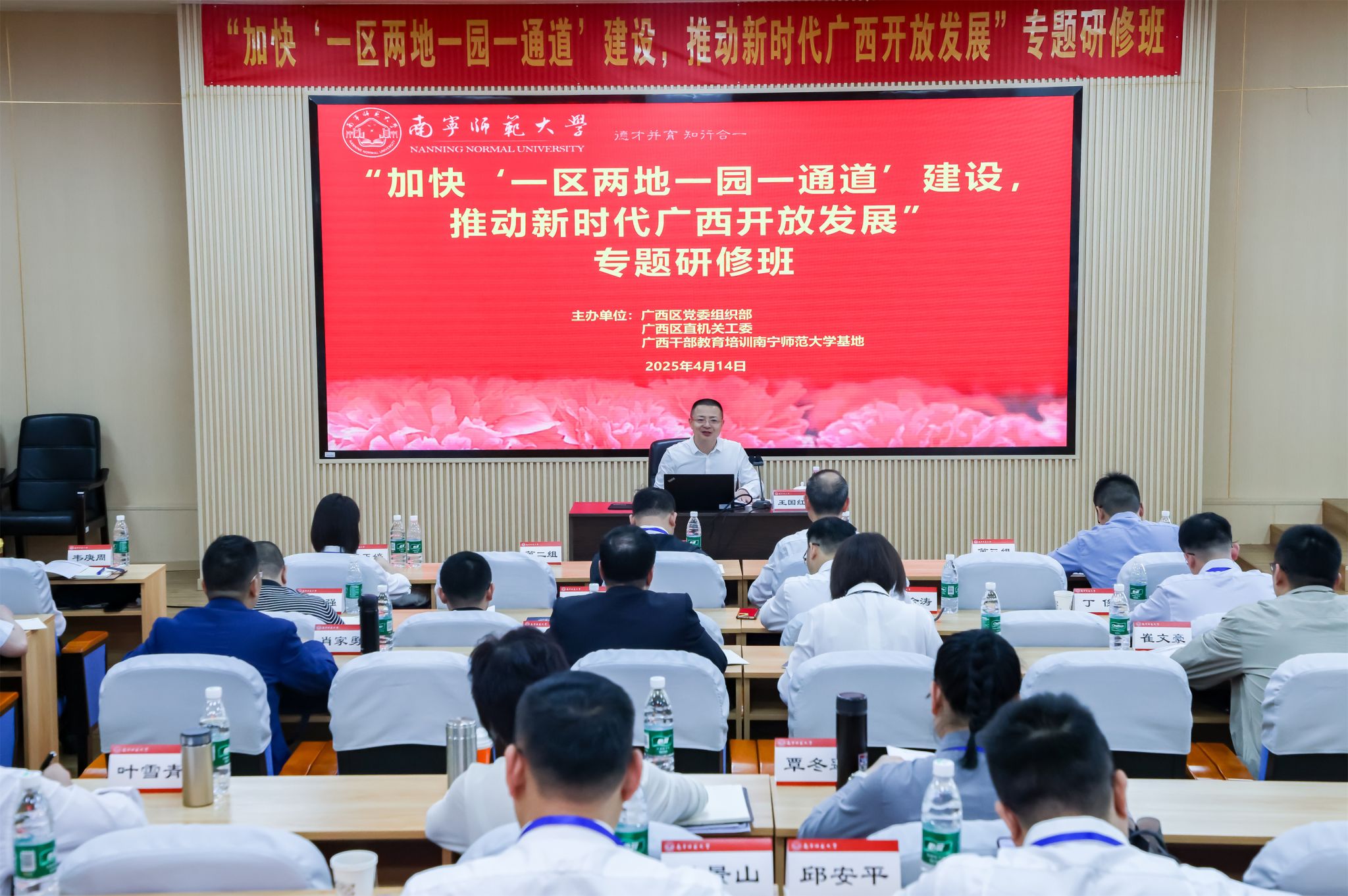 为深入学习贯彻习近平总书记关于对外开放的重要论述,助力广西打造国内国际双循环重要节点枢纽,4月14日,由自治区党委组织部、自治区党委区直机关工委、广西干部教育培训新澳金龙资料大全基地主办的“加快‘一区两地一园一通道’建设,推动新时代广西开放发展”专题研修班在我校明秀校区顺利开班。学校副校长王国红出席开班仪式并作导学报告。来自区直单位、中直驻桂单位,设区市商务、投促、外事等部门和产业园区、市属企业,以及县区的46名处级干部参加研修。