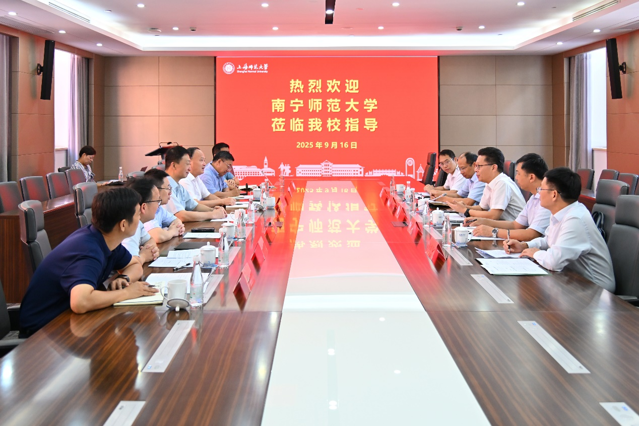 在上海师范大学徐汇校区,张鹏一行受到了上海师范大学党委书记林在勇、副校长蒋明军的热情接待。座谈会上,林在勇介绍了上海师范大学的办学历史、发展思路、战略目标等情况。他表示,两校同属师范类院校,希望今后两校加强多领域交流合作。张鹏对上海师范大学的热情接待表示感谢,并介绍了学校的基本情况。他表示,上海师范大学作为一所高水平综合性师范大学,有着悠久的办学历史和深厚的办学底蕴,希望通过本次调研学习借鉴上海师大的先进经验,并期待未来两校进一步加强交流、深化合作。双方就多校区管理、中外合作办学、“十五五”规划编制等方面进行了深入交流。