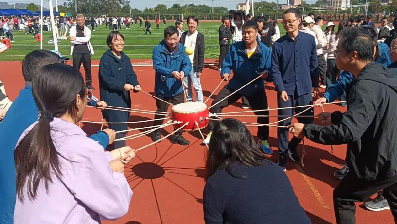 “鼓动人心”趣味赛是我校教职工运动会的特色项目,采用十二人团队参赛。队员们共同控制鼓面,并配合小球进行准备。裁判发令后,队员同步拉放绳索,调节鼓面的高度与水平度,将球从鼓面中心上方抛下,合力使球在鼓面上连续颠起。