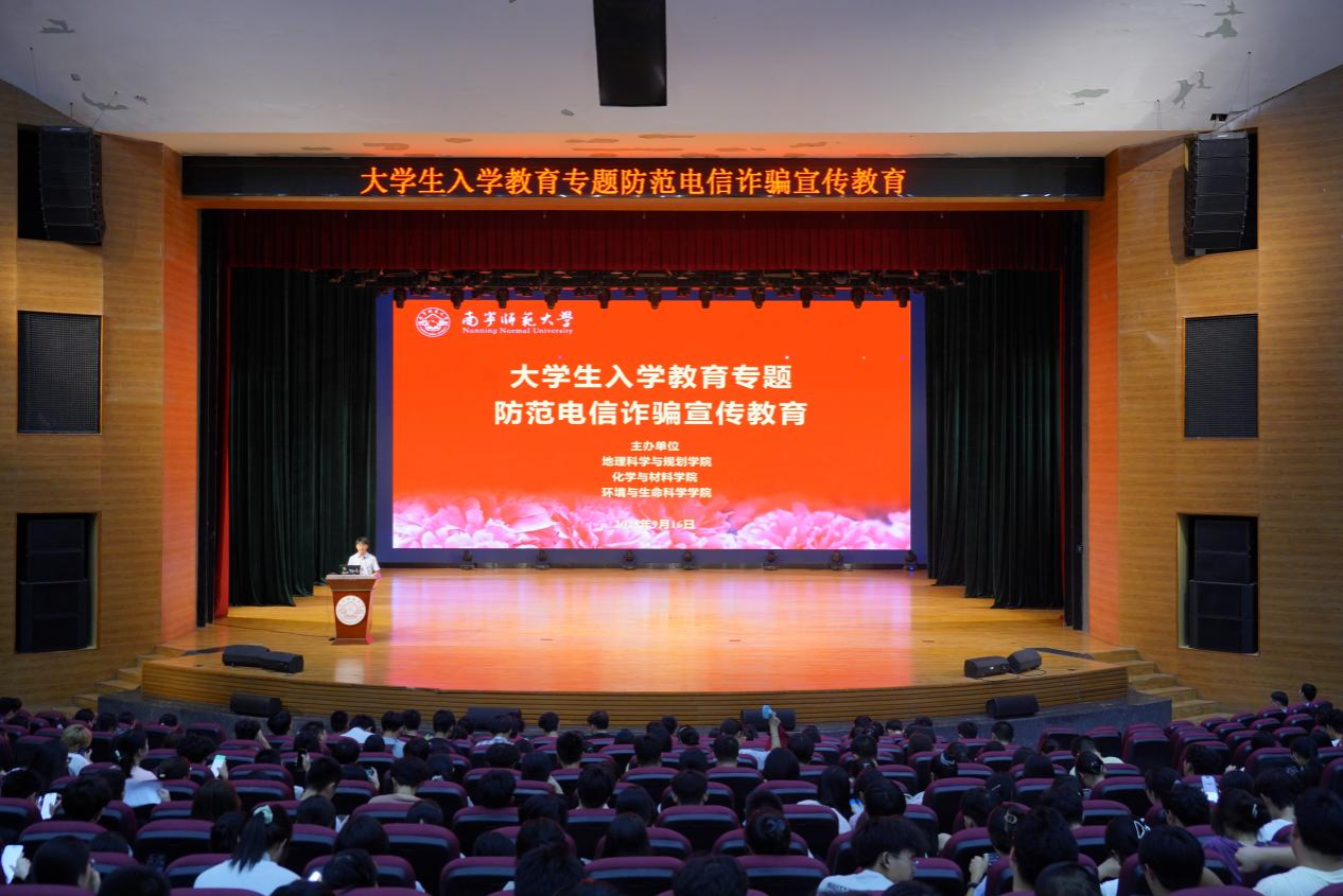 9月16日下午,地理科学与规划学院、化学与材料学院、环境与生命科学学院在武鸣校区1号报告厅共同组织开展了2025级新生入学教育之防范电信诈骗宣传教育专题讲座。本次活动特邀南宁市公安局城镇派出所陆阳警官担任主讲,由地理科学与规划学院辅导员冯佳乐主持。