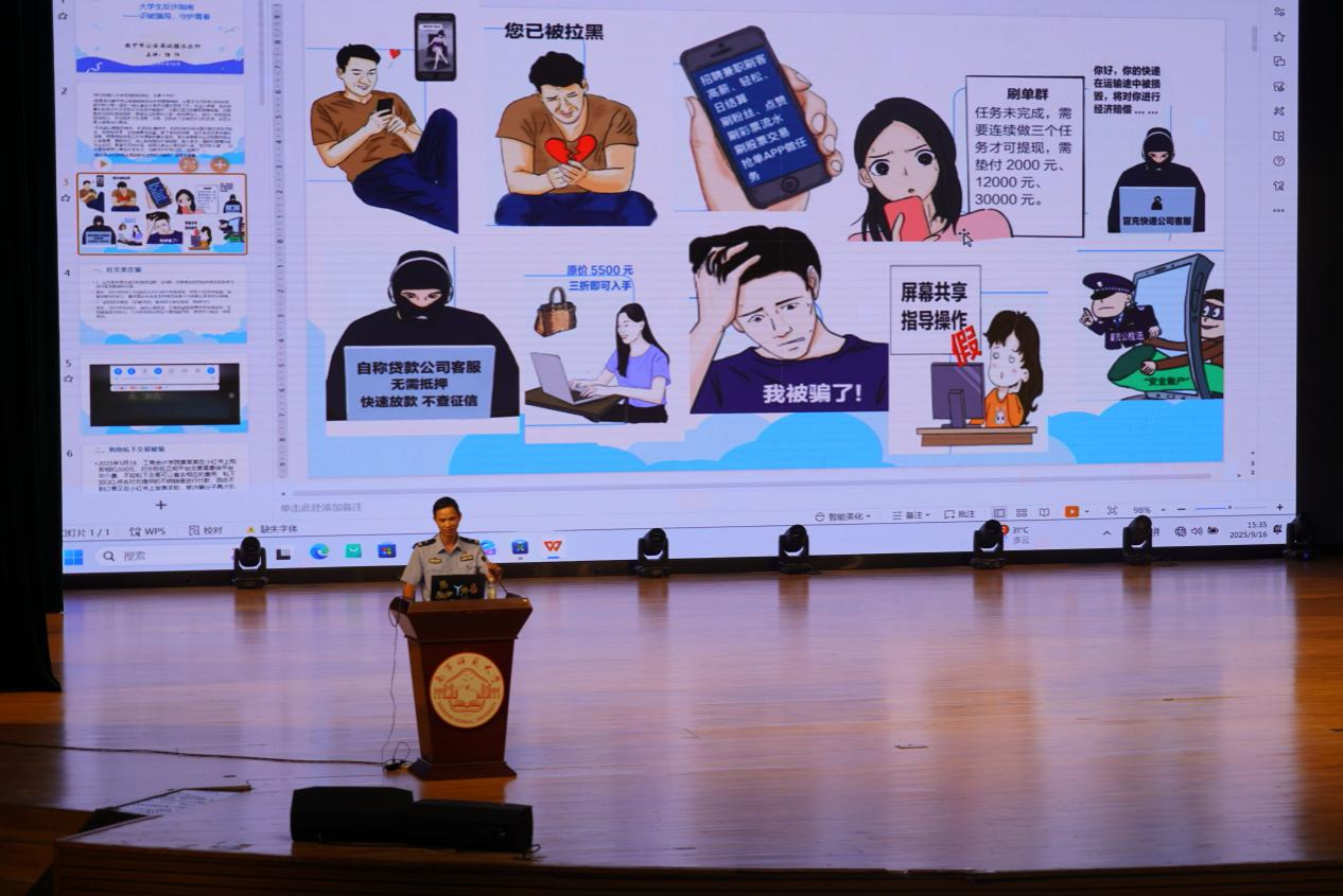 陆阳警官首先从大学生实际生活出发,深入浅出地阐述了电信诈骗的严重社会危害,重点剖析了交友诈骗、冒充公检法、游戏代练、兼职刷单等常见诈骗手法。他结合真实案例,生动还原诈骗过程,揭露犯罪套路,切实增强新生对各类骗局的识别能力。随后,陆警官通过播放反诈短视频、解析高频诈骗案例,系统拆解了诈骗分子的运作模式和心理控制手段,进一步提升了同学们的防范意识。