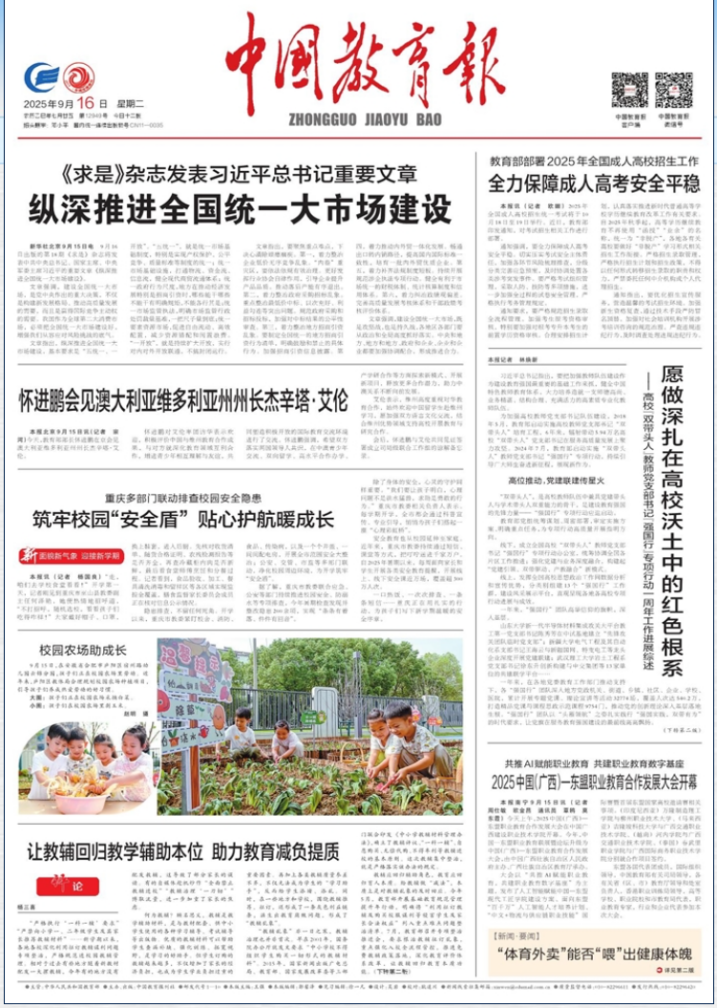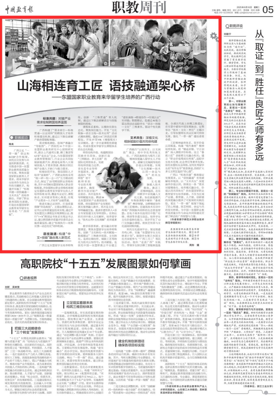 2025年9月16日,《中国教育报》刊发我校职业技术师范学院陈良院长署名文章《山海相连育工匠语技融通架心桥——东盟国家职业教育来华留学生培养的广西行动》,全文如下——