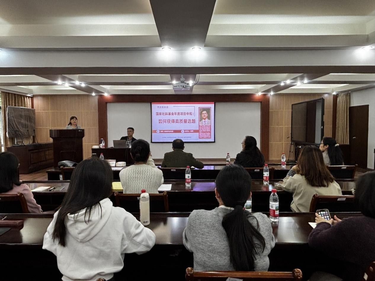 为切实做好2026年度国家社会科学基金项目的申报组织工作,有效提升我校教师的项目申报质量,11月5日下午,科研处、国内合作处、经济与管理学院在明秀校区鸿远楼409室联合主办了2026年度国家社科项目申报辅导讲座。此次讲座邀请广西大学黎鹏教授做申报辅导,经济与管理学院院长何玲玲教授主持。