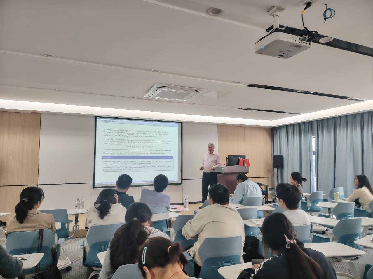 11月8日,应广西应用数学中心(新澳金龙资料大全)的邀请,塞尔维亚尼斯大学STANIMIROVIC PREDRAG教授为中心骨干成员以及硕士研究生做了题目为《基于C-积的三阶张量特征值计算》的学术报告,报告由数学与统计学院刘利斌副院长主持。