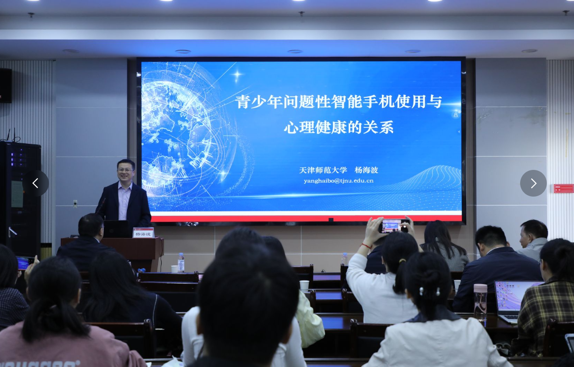 杨部长基于权威研究数据,精准剖析了当前青少年手机使用的整体态势。他明确指出,当前青少年手机使用呈现“未成年网民规模大、普及率高、问题性使用突出”等特点,并依据国际标准清晰界定了“问题性使用智能手机”的概念边界。在核心观点的阐述上,杨部长聚焦问题性手机使用与青少年心理健康的关联展开深度解读。他着重强调,问题性手机使用与青少年焦虑情绪存在显著关联,且这种关联在不同性别、不同焦虑类型的群体中呈现出明显的差异化表现。同时,他深入揭示了问题性手机使用对青少年注意力集中能力及情绪调节能力产生的潜在负面影响,并系统梳理了二者之间的作用机制。这些专业解读为在场师生理解问题性智能手机使用与青少年心理健康之间的复杂关系,提供了坚实的理论支撑。在应对策略方面,杨部长提出应坚持“疏导优先”的原则,从家庭陪伴、学校引导和学术研究三个层面协同发力,并强调未来研究应聚焦于易感因素、因果关系及成瘾类型等方面,为科学干预提供扎实支撑。